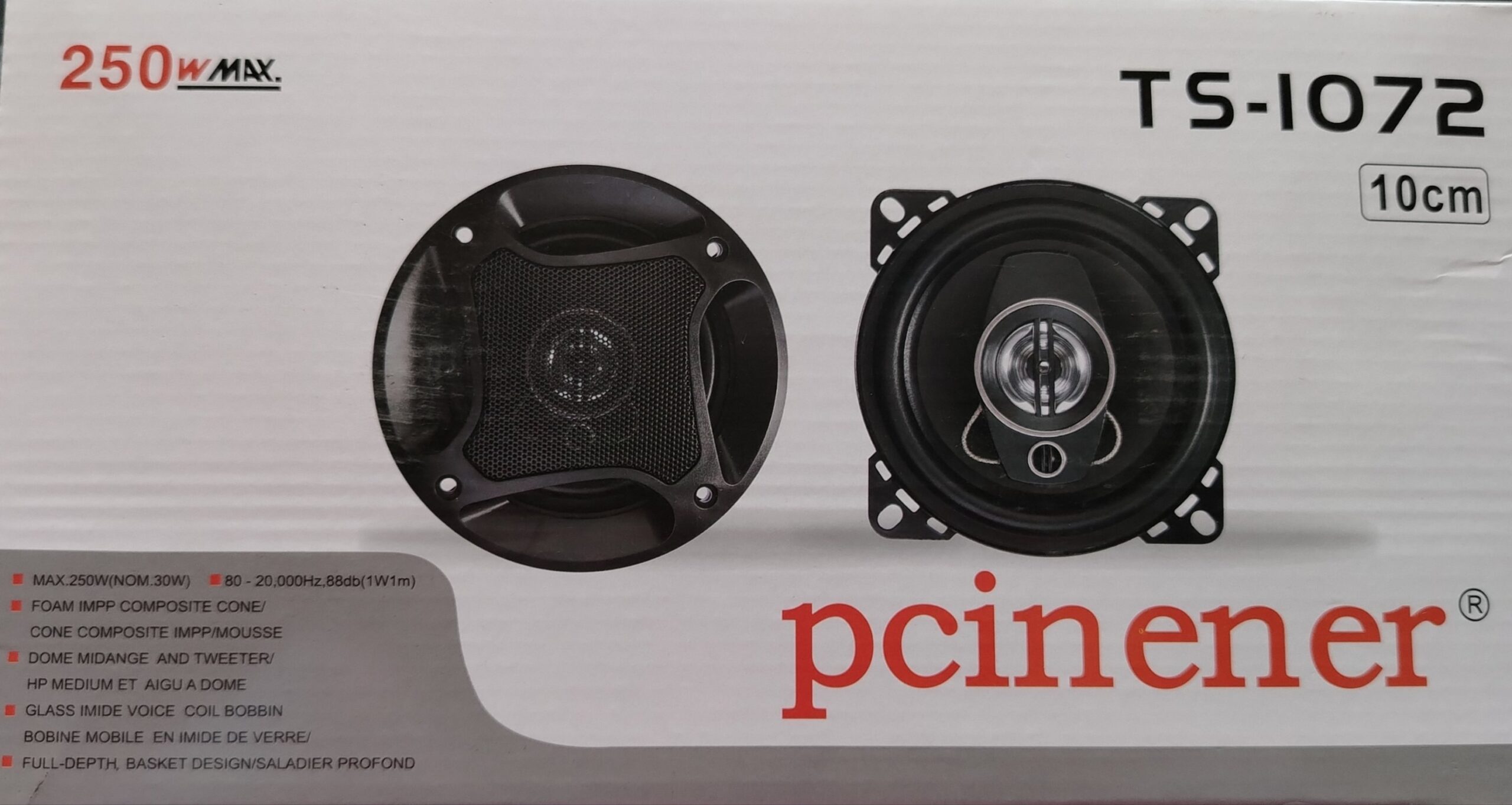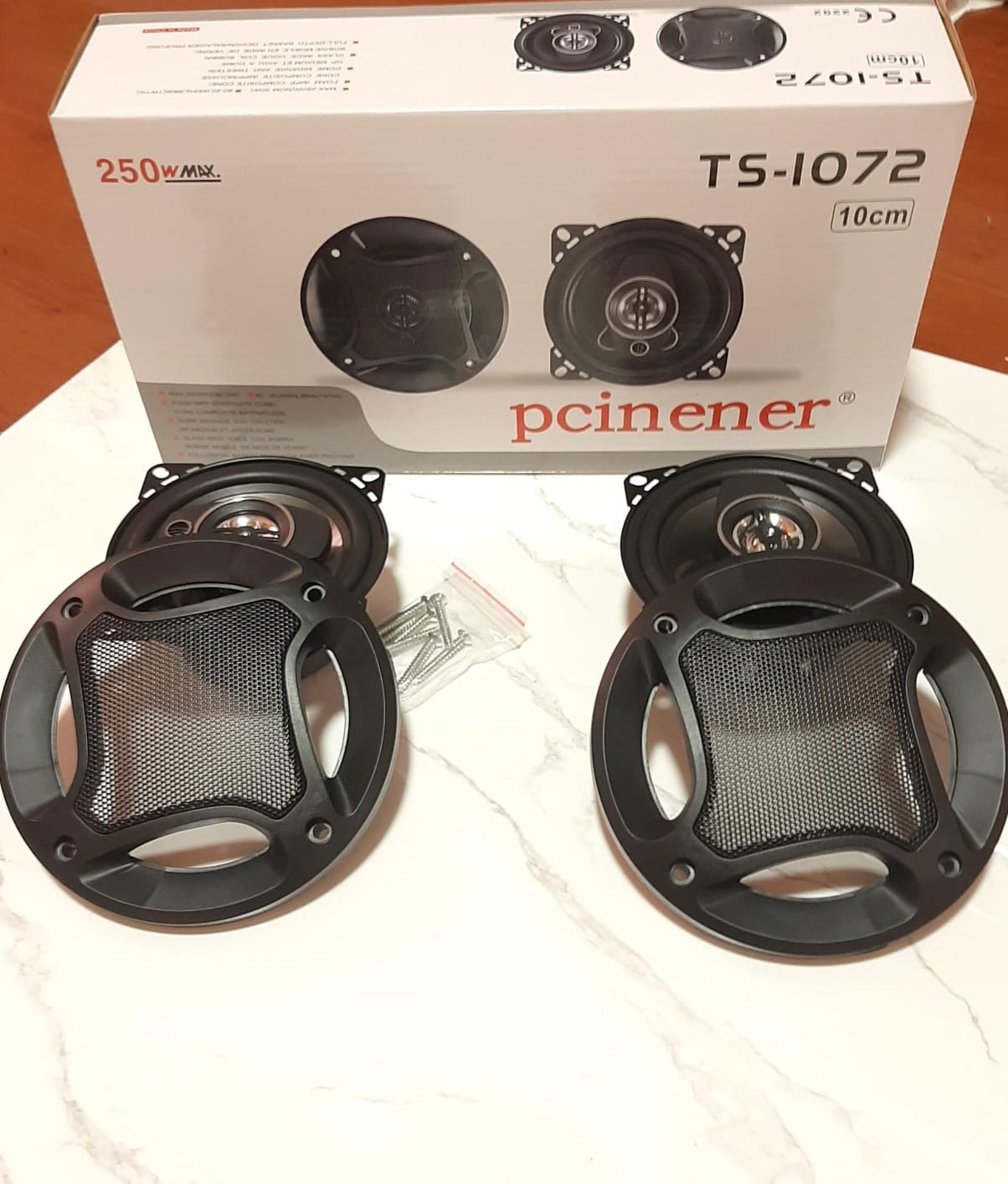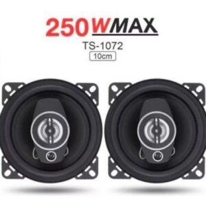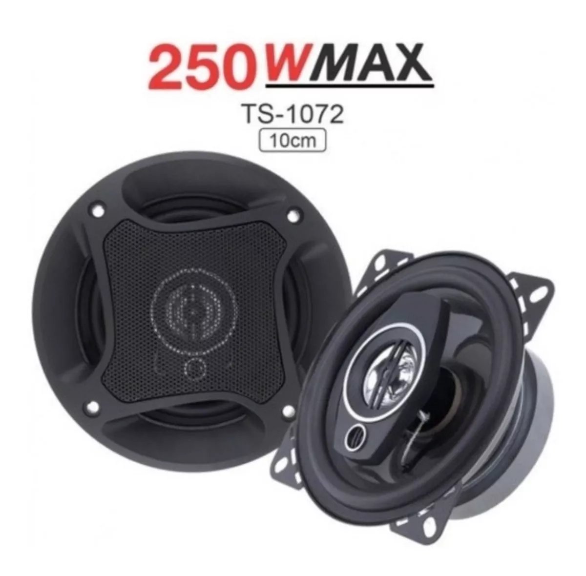 modelo TS-1072, de 10 cm de diámetro y con una potencia máxima de 250W. Estos altavoces están diseñados para mejorar el sonido del sistema de audio de un vehículo, ofreciendo una reproducción de sonido más clara y potente.