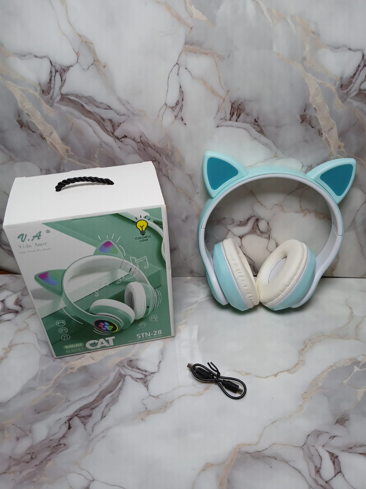 AUDIFONOS CON OREJITAS Y HUELLA CELESTE